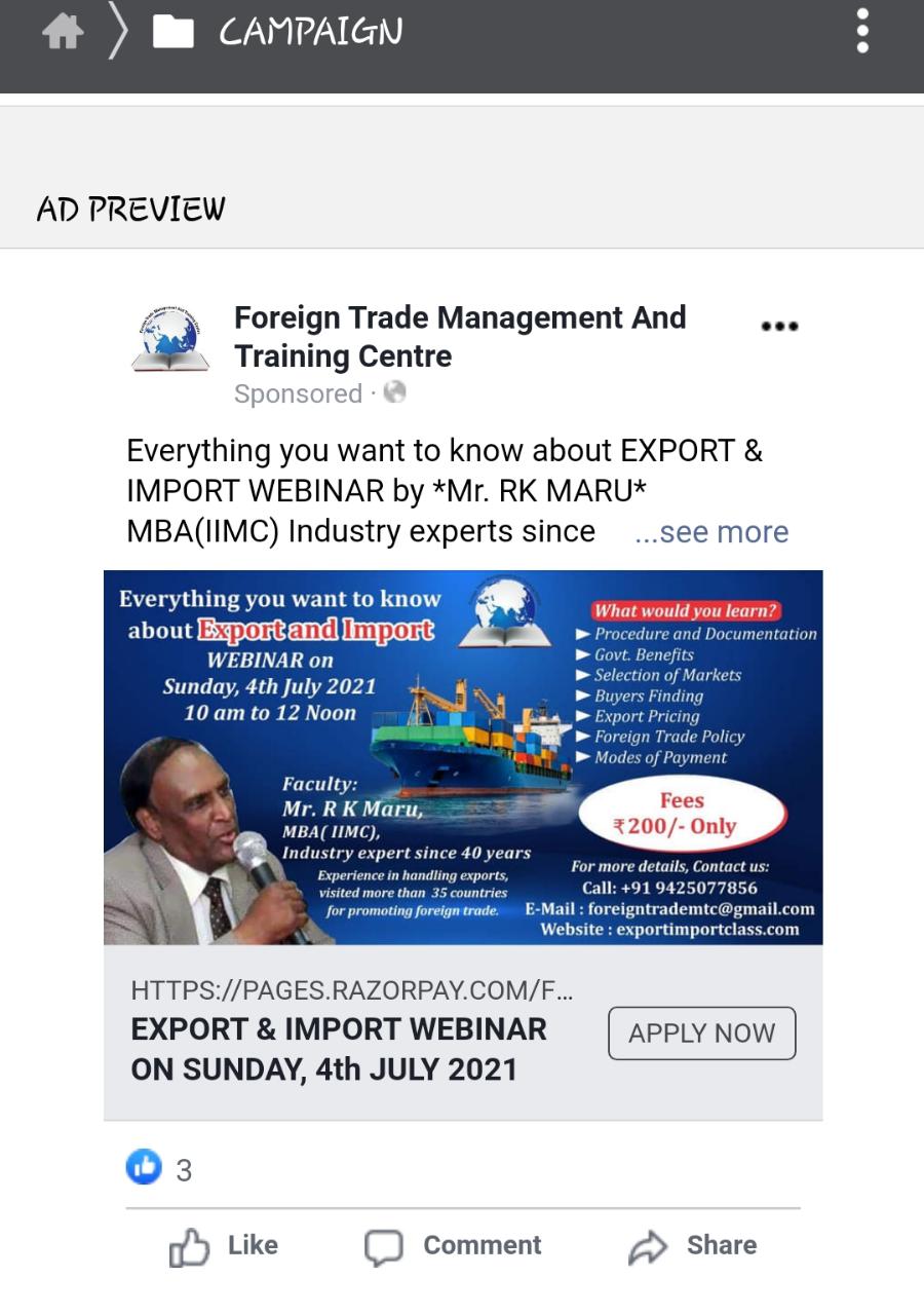 Export Import Training Program We will be conducting a Webinar on "Every Thing You Want To Know About Export And Import" on 4 July 2021 from 10 a m to 12 noon. It will be a very informative and useful webinar. We will cover following topics: đź’ˇProcedure and Documentation đź’ˇGovt. Benefits đź’ˇSelection of Markets đź’ˇBuyers Finding đź’ˇExport Pricing đź’ˇForeign Trade Policy đź’ˇModes of Payment Fee: Only Rs 200.- Please contact for payment link on 94250 77856.